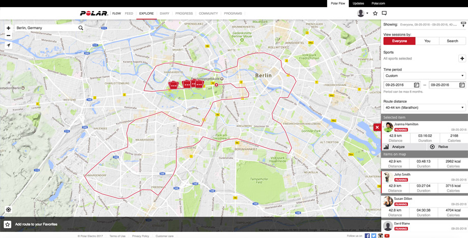 Въведете локация (пр. Берлин),точни дати (пр. 25 Септември 2016) и дистанцията (маратон). И готово - имате списък на хората, които са избягали маратона в Берлин, може да разгледате маршрута и да видите техните резултати.