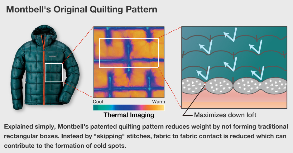Използваният от Montbell пух е не само висококачествен и ултра лек. За ветровитите заснежени върхове, както и за ежедневните разходки до супермаркета, Montbell произвеждат широка гама пухени облекла. Те създават всяко яке със специфично предназначение и за да отговаря на изискванията, които то поставя, използват различни материали и техники, като уникалното разположение на шевовете, за създаването на възможно най-добрия продукт. Това ви позволява да направите най-добрия избор отговарящ на нуждите ви.
