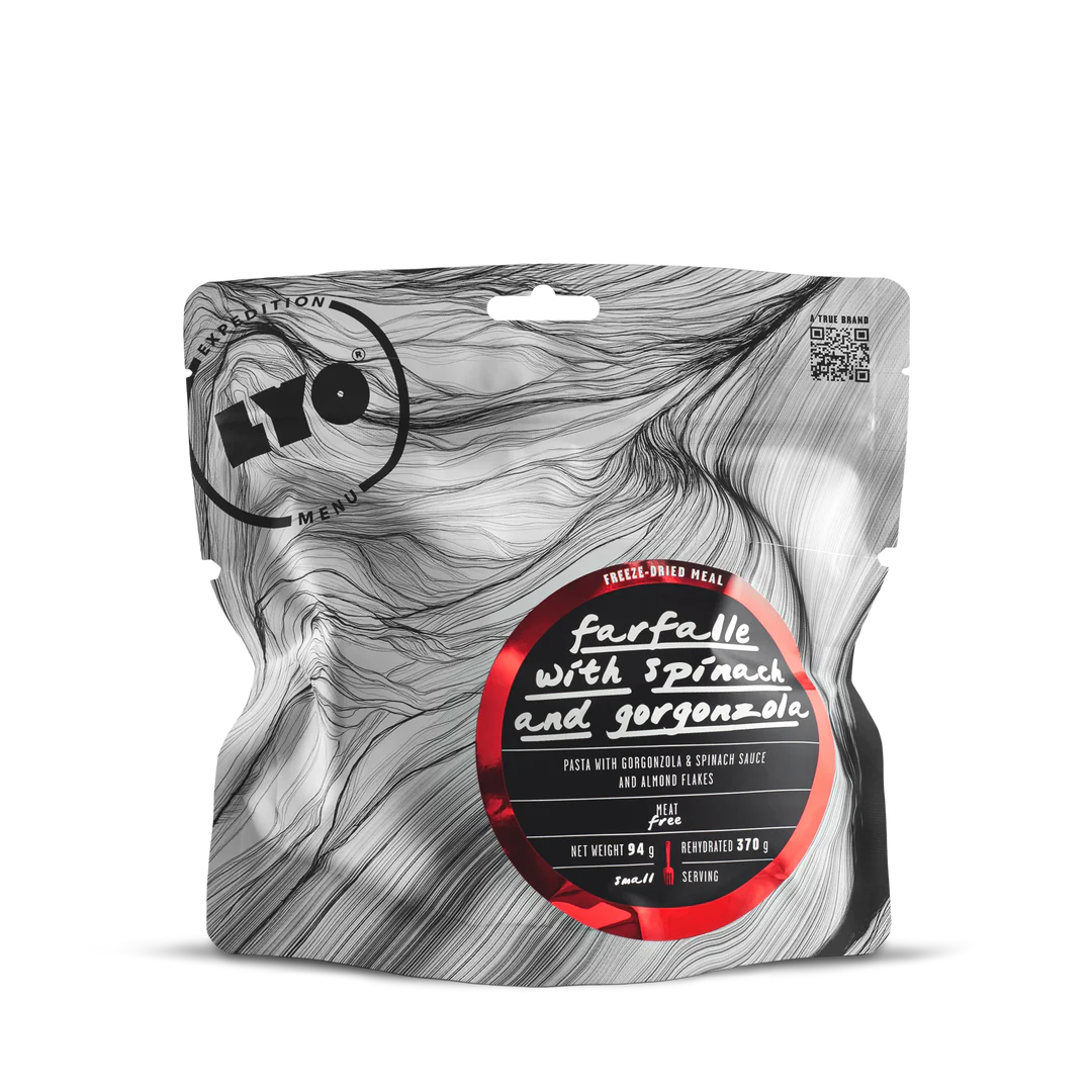 Любимата италианска панделкова паста, farfalle, среща класически кремообразен сос от горгонзола, спанак и заквасена сметана, за да създаде перфектна хармония от вкусове и текстури. Фините бадемови люспи придават допълнителна деликатност на това изключително ястие. Балансирано, богато и засищащо – подходящо за всяко приключение сред природата.