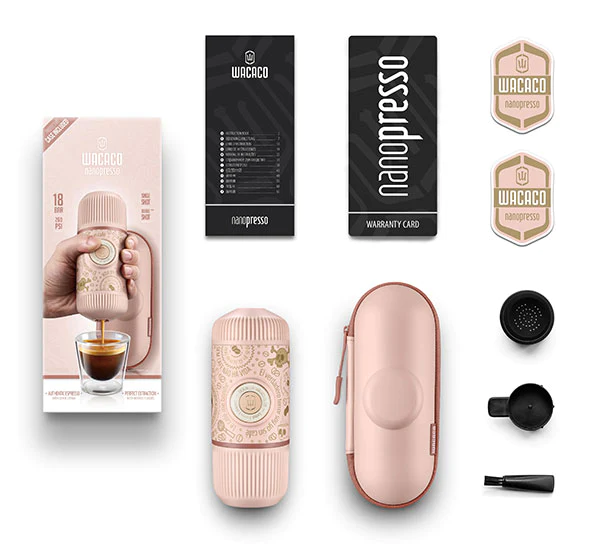 Пакетът включва Nanopresso, защитен калъф, вградена чаша за еспресо, филтърна кошница, лъжичка, четка, книжка с инструкции на различни езици, гаранционна карта и два стикера.