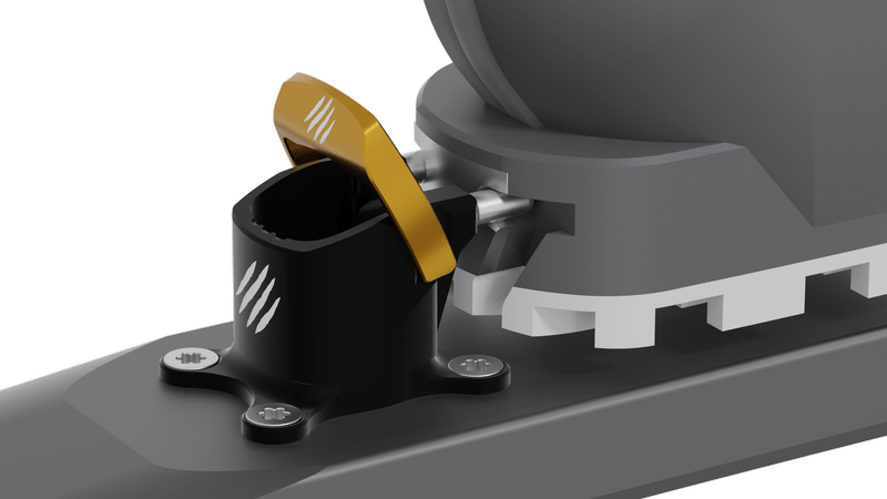 Новият механизъм на петата осигурява безопасно странично и вертикално освобождаване на ски обувката. В режим на изкачване е възможна регулация на позицията на крака.